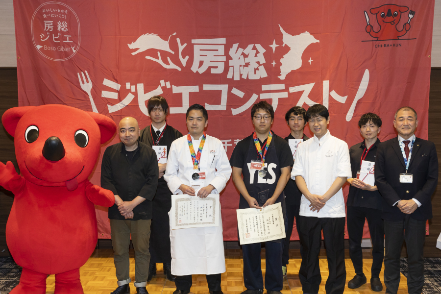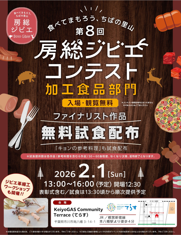 観覧・試食無料!「第8回房総ジビエコンテスト」2/1(日)開催! 2026年1月27日 「食べてまもろう、ちばの里山」をコンセプトに、加工食品(または加工食品になりうる料理)を対象とした「第8回房総ジビエコンテスト(加工食品)」を、2月1日(日) KeiyoGAS Community Terrace(てらす)にて開催します! 当日は、実食審査に勝ち進んだ5作品の無料試食配布を実施! また参考料理として「キョンのラザニア」の無料試食配布も行います 無料試食配布は13:30頃からを予定(整理券配布・各食50~60個程度となります) 入場・観覧無料なので、ぜひみなさまご来場ください♪ ファイナリスト5作品 ▼作品名「猪バックリブのビリヤニ」 地産地消cafe&bar Cluster(柏市)日暮 尚也 氏 ▼作品名「房総ジビエと地元野菜の黒アヒージョ」 カフェこっとんぼーる(長南町)澤田 康一 氏 ▼作品名「鹿モーレ・タコプレート」 フランス料理 la falaise(佐倉市)兼坂 英司 氏 ▼作品名「鹿肉と落花生の最中」 酒亭 赤坂かねさく(東京都港区)岡田 東司 氏 ▼作品名「千葉県産小麦粉とどんぐり粉のもちもち涼皮 イノシシ広東叉焼のせ」中國料理kujikuji(佐倉市)久慈 源一郎 氏 (参考料理)キョンのラザニア ※画像はイメージとなります たべて、つくって、ふれるジビエ~房総ジビエまるごと体験~ 当日はワークショップや房総ジビエの展示・販売も実施 コンテストと同時開催で「ミニいのししを作るワークショップ」や、「本革のリングノートづくり」、房総ジビエペットフードの販売や各種展示も実施します ■ミニイノシシを作るワークショップ ~イノシシレザーから学ぶジビエ活用~ ジビエのことを学びながら、実際にイノシシ革にふれて体験できるワークショップ かわいいミニイノシシ作りに、ぜひお子さまとご参加ください 参加費無料(最大定員80名/各回20名) ●1回目:13:10~13:40 ●2回目:13:50~14:20 ●3回目:14:30~15:00 ●4回目:15:30~16:00 ■本革表紙のリングノートづくり(イノシシ革ほか) 天然の表情をもつ本革は、同じ革でもシワや色ムラが異なり、使い込むほどに経年変化で表情が変わります。世界で一つだけのハンドメイドの本革ノートづくりを体験してみませんか?(イノシシ革ほか1,500円~) ■房総ジビエペットフード販売コーナー 千葉県産の房総ジビエ100%を使用した無添加ペットフードも各種販売します ワンちゃんにも、おいしい房総ジビエを味わってほしい♪ そのほか、各種ジビエ加工品の展示なども予定しています 当日は食べて、作って、実際にふれてみて、房総ジビエをまるごと体験してくださいね! 表彰式には、千葉県マスコットキャラクター チーバくんも来てくれますよ♡ ※昨年の表彰式の様子 【第8回房総ジビエコンテスト(加工食品)】 日時:2026年2月1日(日)13:00~16:00(開場12:30) ●調理実食審査 13:00~14:30 ●一般試食配布 13:30頃~順次(整理券は13:15頃~配布予定) ●表彰式 15:00~ ●ワークショップ、各種展示販売 12:30~16:00 会場:KeiyoGAS Community Terrace(てらす) (千葉県市川市南八幡3-14-1) アクセス:JRまたは都営新宿線 本八幡駅より徒歩4分 料金:入場無料(一部有料参加・販売等あり) ※会場に専用の駐車場・駐輪場はございません。お越しの際は、電車・バス・タクシーなどの公共交通機関のご利用にご協力ください コンテストのチラシはこちらからご覧いただけます 最新情報 「房総ジビエフェア2026」2/1(日)~3/3(火)開催! 2026/01/27 観覧・試食無料!「第8回房総ジビエコンテスト」2/1(日)開催! 2026/01/27 「第8回房総ジビエコンテスト」「房総ジビエフェア2026」参加者・参加店募集! 2025/12/10 第7回房総ジビエコンテスト動画公開 2025/02/20 第6回房総ジビエコンテスト スペシャリテ部門 動画を公開中 2024/10/30